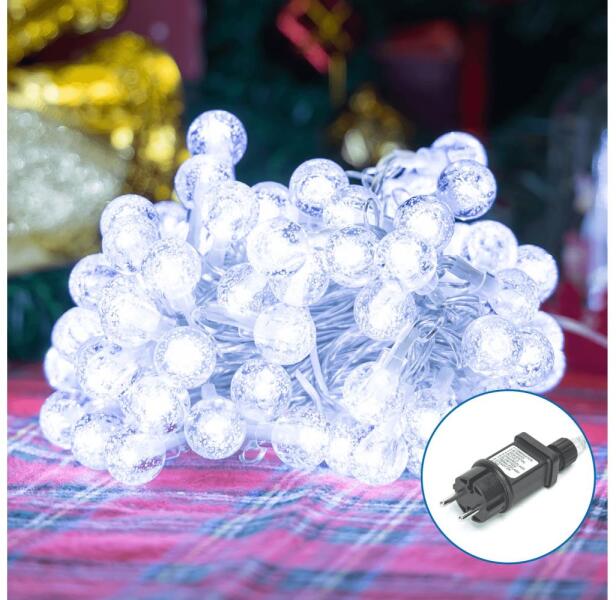 Karácsonyi fényfüzér, amely tökéletesen alkalmas kertdíszítésre. Alacsony fényerőssége miatt dekoratív világításként használható. Táplálás tápkábelen keresztül (a transzformátor a csomag része). Csatlakozó típusa: E – további információk találhatók itt itt. 8 világítási funkció. A funkciók közötti váltást a csatlakozón található kapcsoló teszi lehetővé. Memória funkció és időzítő. Fény színe: hideg fehér. LED-ek száma: 100. A megvilágított kábelhossz: 10 m. Tápkábel hossza: 3 m. Kábel színe: átlátszó.
