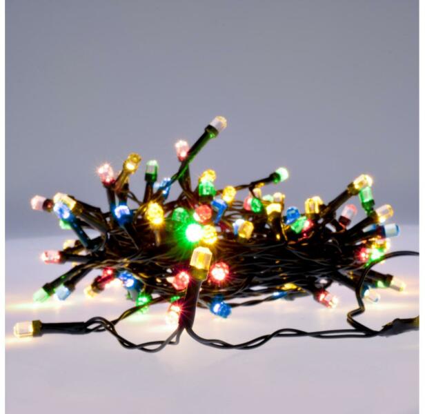 LED kültéri karácsonyi fényfüzér. LED diódák száma: 200. Fény színe: multicolor. Időzítő és fényerőszabályozó funkció. Az időzítő 6 óra után kikapcsolja a világítást, és 18 óra után automatikusan újra bekapcsol.   A lámpák távolsága: 10 cm. A világító kábel hossza: 20 m. A tápkábel hossza: 5 m. A kábel színe: zöld. Védelmi osztály: IP44 (benti és kültéri használatra egyaránt).