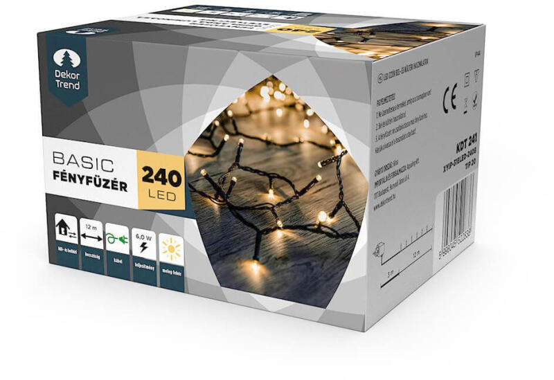 A legegyszerűbb fényfüzér kedvező áron. 240 LED található rajta, amivel alkalmas közepes és nagyméretű karácsonyfák, valamint párkányok, kandallók díszítésére. De IP44-es szigetelésű kábele miatt egyre többen használják négy évszakban, kültéren is. Meleg fehér fénye a délutáni napsugarak barátságos színét idézi, kellemes hangulatot teremtve. Zöld kábele fenyőfán alig látszódik, de bármilyen sötét háttéren kiválóan érvényesülnek a LED-ek fényei rajta. A fényfüzér 220 V-os hálózati csatlakozóval rendelkezik, standard konnektorról működtethető.