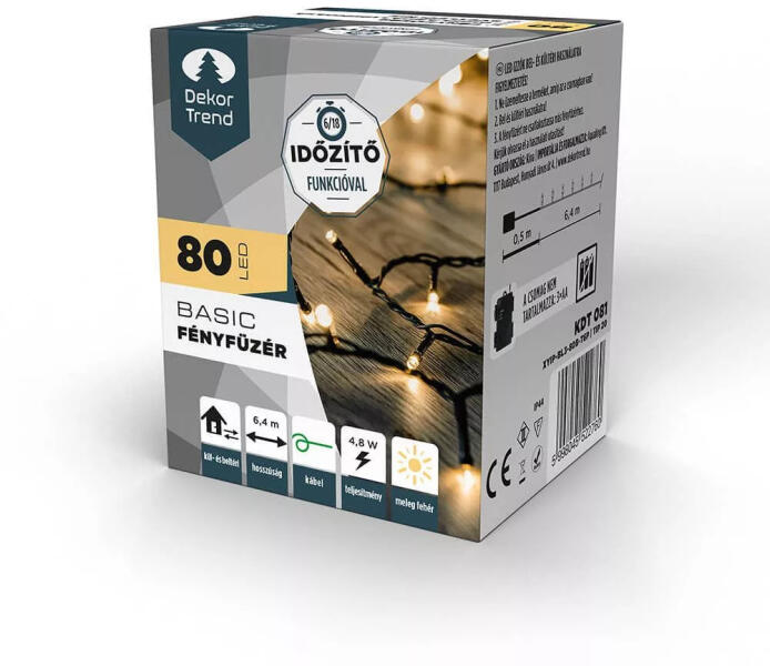 DekorTrend KDT 081 WW Kültéri elemes Basic LED fényfüzér timer időzítő funkcióval, 80 db MELEG FEHÉR LED-del, zöld kábel, 640 cm