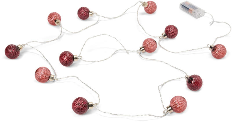 LED gömbös fényfüzér Szín: Piros üveggömbök Átlátszó kábel és elemtartó rekesz Anyag: Gömbök: üveg Elemtartó rekesz: műanyag Méretek: Teljes hossz: kb. 240 cm Gömbök Ø egyenként: kb. 4 cm A gömbök közötti távolság egyenként: kb. 19 cm Tápvezeték hossza az elemtartó rekeszig: kb. 30 cm Tartalom: 2 db LR06 (AA) elemmel és használati útmutatóval Elem/akku élettartama: Világítás időtartama 1 elemkészlettel: kb. 200 óra Energiahatékonysági adatok: Az ártalmatlanításra, valamint az Ön közelében található gyűjtőhelyekre vonatkozó információk a www. tchibo. hu oldalon láthatók 12 db modern és dekoratív üveggömbbelMelegfehér fényszínElemmel – igény szerint és egyszerűen felakaszthatóMindegyik gömb kis akasztófüllelIdőzítő funkció: 6 óra elteltével automatikusan kikapcsol, 18 óra elteltével újra bekapcsolBeltéri használatra